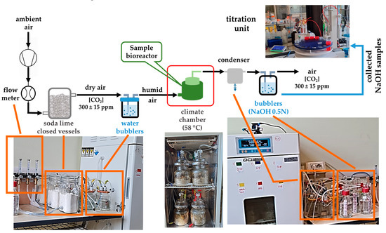 The installation for testing the biodegradability of the studied polymer composites was established considering both the provisions of the ISO 14855-1/2022 (58 °C, 50% humidity) [25], as well as some practical aspects in conducting experiments in the laboratory. As may be observed in Figure 1, the components of this installation were (i) a gas inlet circuit (CO2 free air), (ii) climatic chambers (Haida International, Dongguan City, China), (iii) bioreactors for samples made of cylindrical glass vessels tightly covered with customized design (Adrian Sistem SRL, Bucharest, Romania) that were placed in the climatic chambers, and (iv) a gas outlet circuit (with CO2 resulting from the biodegradation processes).