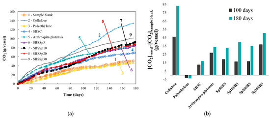 Also notable in Figure 2 is the behavior of the spirulina biomass, which shows an increase in the mass of CO2 evolved in the first 100 days, followed by a decrease in the rate of CO2 production. This evolution may be assigned to the unique characteristic of spirulina biomass, which has a high protein content (40–70%) [27] compared to other types of plant biomass. The spirulina biomass produces more carbon dioxide in the first 100 days, but after this period, the mass of carbon dioxide absorbed in the sodium hydroxide in the outlet circuit becomes almost equal to the CO2 produced by Sp5SBS, Sp10SBS, and Sp20SBS. The Sp30SBS composite produces more carbon dioxide than all the other samples. This behavior may be explained by a faster and easier biodegradation of proteins contained in the spirulina biomass, relative to other biopolymers. Also, one may appreciate that the decomposition of proteins into amino acids leads to an attractive source of nutrients for the microbiome of the biodegradation media and may cause higher biomass growth [28,29].