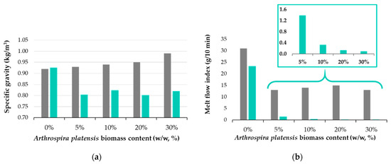 Physical properties of polymer composites: (a) specific gravity and (b) melt flow index for initial samples (grey bar) compared with samples after 180 days of biodegradation in industrial composting conditions (green bar).