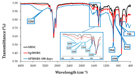 Figure 4 presents the infrared absorption spectra of the SBSC material (control sample) and Sp30SBS that were not subjected to the biodegradation test, in comparison with the FTIR spectrum of the Sp30SBS sample after 180 days of industrial composting testing. The three spectra were chosen for the illustration of the IR results. The spectra of the other samples containing biomass are quite similar, with small differences in the 3200–3800 cm−1 and 1400–1800 cm−1 wavenumber domain.
