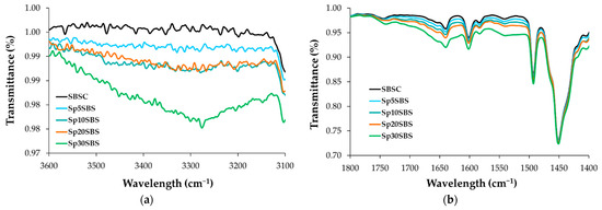 Infrared spectra of SBS-based initial composites (before biodegradation) in the regions (a) 3600–3100 cm−1 and (b) 1800–1400 cm−1.