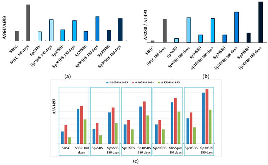 Figure 6a shows the ratio of the absorbance values measured at 964 cm−1 and absorbance values measured at 698 cm−1. It was observed that the initial samples show similar absorbance ratios, regardless of the added biomass percentage, which shows that the addition of biogenic material does not influence the ratio between polybutadiene and styrene in the composites that were not subjected to the biodegradation test. The situation changes notably for the samples that underwent the composting test. The ratio A964/A698 changes in favor of the butadiene component, indicating that the biodegradation process affects the two blocks in the SBS structure differently. Thus, it can be concluded that the polymer chains are predominantly attacked at the aromatic nucleus through possible substitution reactions that reduce the number of monosubstituted benzene groups.