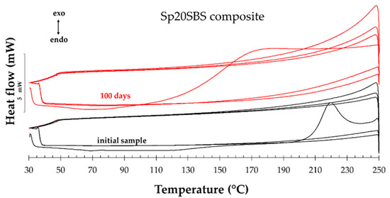 Differential Scanning Calorimetry (DSC) analysis for samples heated in air was used to test the thermal properties of materials before and after the composting test. In the context of the present study on SBS composites with Arthrospira platensis biomass, DSC analysis can provide further insights into the behavior of the polymer throughout the composting process.