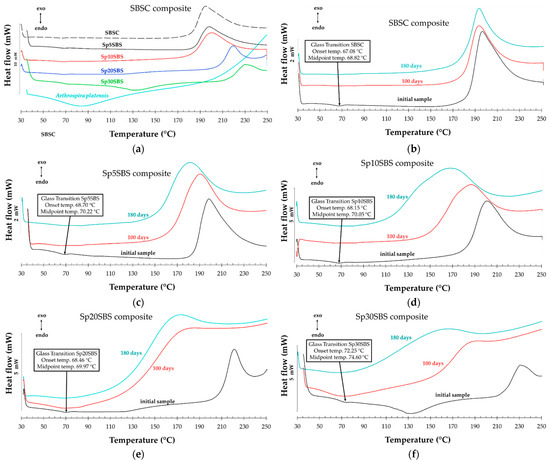 DSC thermograms for (a) SBS-based initial composites and comparative DSC curves for composites before (black lines) and after biodegradation for 100 days (red lines) and 180 days (blue lines) for (b) SBSC, (c) Sp5SBS, (d) Sp10SBS, (e) Sp20SBS, and (f) Sp30SBS composites.