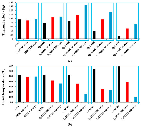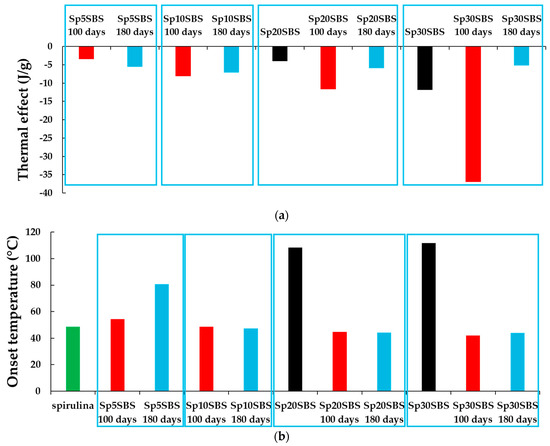 Graphical representation of the (a) normalized exothermal effect (J/g) and (b) onset temperature (°C) registered in the first cycle of heating of SBS-based composites with different loading % of Arthrospira platensis biomass.