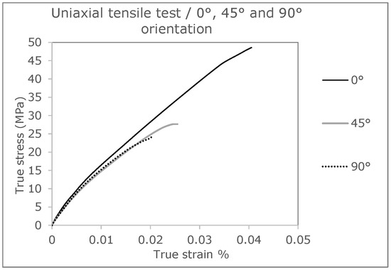True stress-strain curves with different strand orientations (0°, 45° and 90°) [36].