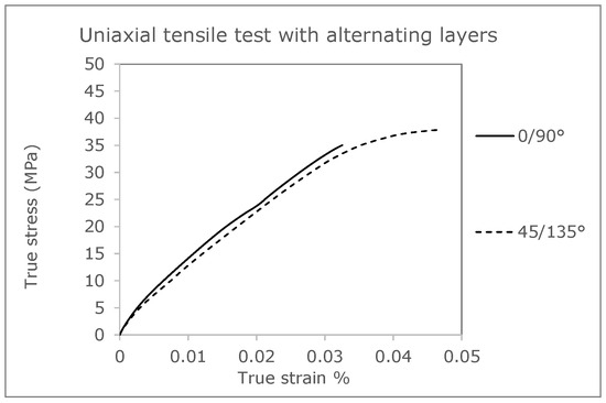True stress-strain curves with cross-layered structured 0°/90° and 45°/135° [36].