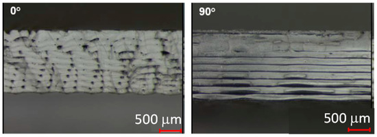 Directional dependence is affected by the adhesion between the individual strands and the layers. In addition, porosity can be seen when looking at the fracture surfaces of the tensile test specimens with different strand deposition directions. In this study, an average porosity of 6.9% can be determined. This is accomplished by measuring the samples and the resulting volume. The porosity can be determined via the mass and the comparison of the density of the polymer. Figure 3 shows the porosity of tensile test bars in the 0° and 90° deflection directions on fracture surfaces.