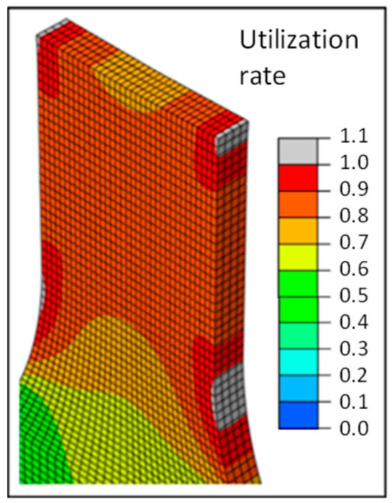 The plastic deformation behavior of semi-crystalline polymer materials is coupled with strain hardening [41]. The failure is determined via a utilization rate, following the studies of Ferrano et al. [36], according to the following equation: