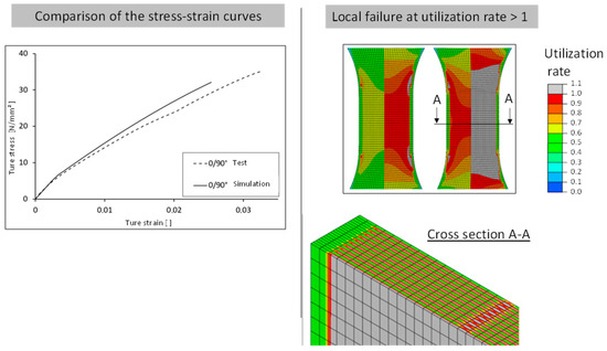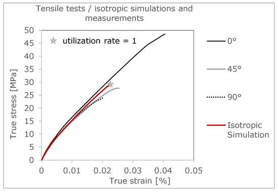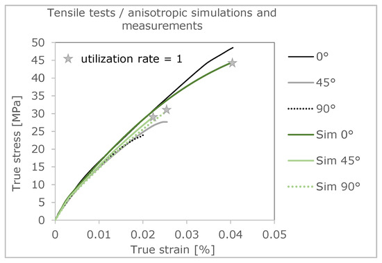 In summary, both anisotropy and failure can be well described using this approach. The 0° direction has the largest differences in both stress and strain, whereas at a 90° layering direction, the differences are significantly smaller. Last but not least, the comparisons of the deformation behavior in Figure 12, Figure 14 and Figure 16 enable an evaluation of the results in relation to the level of load. A sufficiently accurate prediction of the mechanical properties can also be summarized.