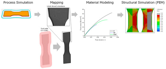 This is followed by the presentation of the quasi-static FEM analysis of the anisotropic and elastoplastic material behavior created from the directional tensile test. Here, a coupled process-structure simulation is performed. The aim is to characterize a material model which can be applied for an arbitrary strand orientation based on the tension specimen [42] with 0°, 90° orientation and which generates a realistic prediction of the mechanical behavior for FFF manufactured components as well as for reinforced thermoplastics in general [33]. After realizing process simulation and creating a basic FEM model, local strand orientation is mapped on FEM mesh, the material model has to be fitted, followed by coupling of local strand orientation and material behavior for structural simulation. The basic procedure is shown in Figure 6.
