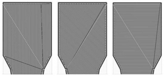 The Ultimaker Cura® 4.8 software is applied for the process simulation. This is used to determine the layer thickness and strand orientations (Figure 7) relevant for the anisotropic FEM analysis. As for the tensile test, the three variants, 0°, 45°, and 90° strand orientation, are generated as filling of the tensile specimens. The two outer lines, which limit the filling of the tensile specimen, remain the same for each variant. There are no edge layers covering the infill from the top or bottom side. These data are stored as G-code, which is relevant for the coupled process-structure simulation.