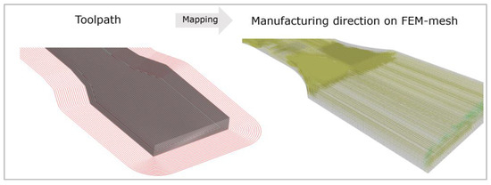 In the next step, the generated data of the process simulation are transferred to the FEM model. The STL file is selected as the donor mesh. The G-code with the desired strand orientation, the so-called mapping, is loaded for this file. The input file is selected as the receiving mesh. Then the alignment of the receiving geometry to the donating geometry is completed because both need exactly the same alignment to position all information of the G-code at the right place. Here, the orientation tensors of the nodes of the process mesh are placed on the nearest nodes of the structural mesh. Thus, an XML file is generated with the orientations at the respective points. Figure 8 shows the mapping of the process simulation, of a tension specimen with 0° filling, onto an FEM model.