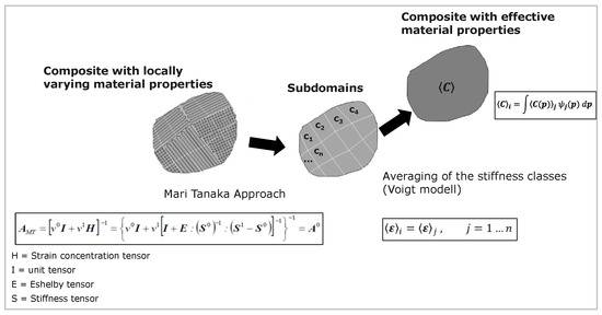 It is determined that the material model is created for the purpose of mechanical analysis. The model used in this work consists of two homogenization steps and is based on the approaches of Mori-Tanaka [29,35] and Reuss [18] as figured out in Figure 9.