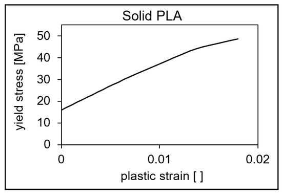 The elastoplastic material behavior is determined by means of test results of the Poisson’s ratio, the modulus of elasticity, and the course of the true stress and plastic strain. The von Mises yield criterion (J2—plasticity) F is used to describe plastic deformation, with which the deformation behavior of a tensile loaded polymers can be well described [27], and it is based on the following equation: