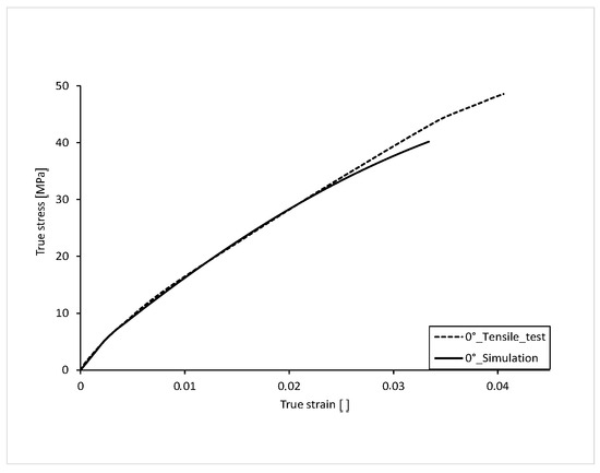 The stress-strain curve with 0° orientation of the filling in the tension bar is shown in Figure 12. For comparison, the curve from the tensile test is also shown. With a fracture stress of 40.19 MPa, the stress-strain curve of the 0° simulation is about 16% lower than that of the test. The elongation at break, with a value of 0.0338, also differs by approximately 16% than that of the test. This deviation in ultimate strain and stress results from the fact that in the tensile test, even after minimal local failure, the tensile bar is still capable of loading for a short time and does not break immediately. In the simulation, the curve is terminated at local failure. Local failure is described in more detail in the following chapter.