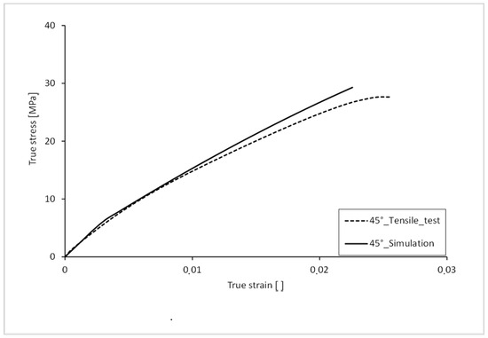 The stress-strain curve with 45° orientation of the filling in the tension bar is shown in Figure 14. For comparison, the curve from the real tensile test is also shown. A deviation can be seen in the elastic range up to approx. 6 MPa. The Young’s modulus of the simulated curve is slightly higher. The plastic strain hardening is more arc-shaped in the test values, which is why the curve of the simulation deviates from the test values here. With a fracture stress of 29.30 MPa, the simulation curve is 6.01% lower than that of the test. The elongation at break, with a value of 0.022, is 11% lower than that of the test.