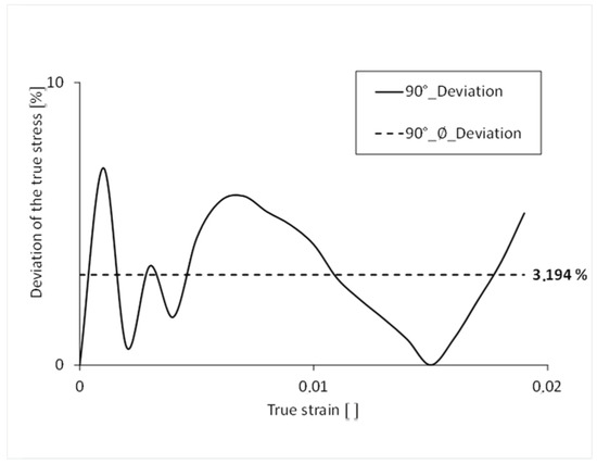 Percentage deviation of the stress over the course of the strain 90°.