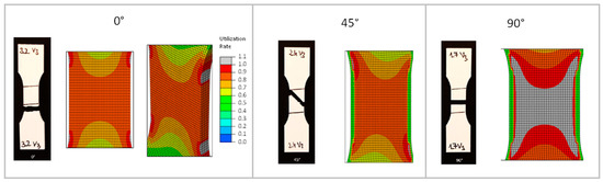 A further validation, in addition to the 45° specimen, which does not serve as an input variable for the adjustment of the material model, is to be carried out by comparing cross-laid tensile test bars. Figure 18 shows the layered structure of a tension rod with 0°/90° direction of layering. Here, the failure of the individual layers is clearly visible, and, for example, the overall failure of the tension rod can be evaluated and compared with a test result. Furthermore, the failure behavior can be attributed to the different strength (breaking stress) as is taken into account using the Tsai–Hill criterion. Areas loaded at 90° to the placement direction therefore fail faster than areas in the main direction, which is related to the typical anisotropic behavior of the investigated material and the manufacturing process.