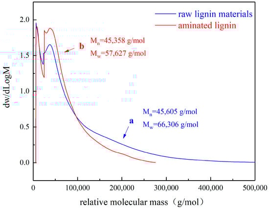 Based on GPC analysis, the molecular weight distributions of raw lignin materials and aminated lignin products are shown in Figure 2.