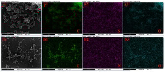 EDS analysis of raw lignin materials (a) and aminated lignin (b). (a1) and (b1) are C elements; (a2) and (b2) are N elements; (a3) and (b3) are O elements.
