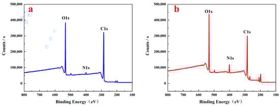 An XPS analysis method was used to understand the changes in the contents of various elements and chemical bonds during the reaction process. Figure 4 shows the XPS spectra of the raw lignin materials and aminated lignin, whereby both the raw lignin materials and aminated lignin contain abundant basic elements such as C and O. However, the absorption peak of the intensity of nitrogen atoms in aminated lignin significantly increases. Furthermore, by comparing the ratios of C and N atoms in the raw lignin material to those of aminated lignin, the C/N ratio in the raw lignin material was found to be 30.59, whereas this ratio decreased to 9.19 in aminated lignin. This change indicates the successful introduction of amino groups into lignin, thereby resulting in an increase in nitrogen content.