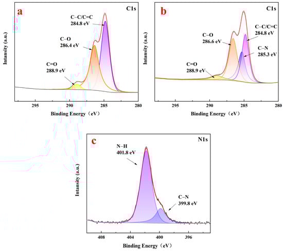 Figure 5 shows the fine spectra of C1s of the raw lignin material (Figure 5a) and aminated lignin (Figure 5b), as well as the N1s of aminated lignin (Figure 5c). As shown in Figure 5a, the spectra of C1s of the raw lignin materials were fitted with three peaks at 284.8 eV, 286.4 eV, and 288.9 eV, belonging to the C=C/C−, C−O, and C=O peaks, respectively [25,26].