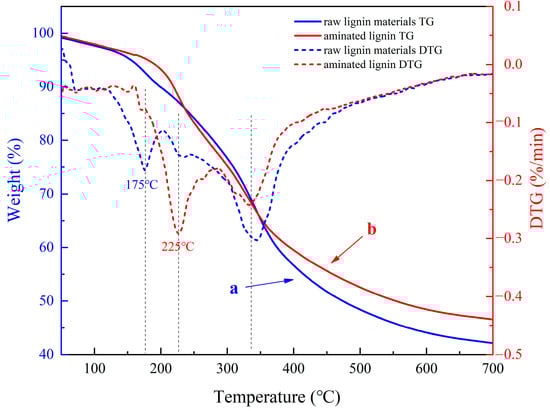 However, the second peak of the thermal weight loss of the raw lignin material is noteworthy, for it occurs at a temperature of 342 °C, while that of the generated aminated lignin is at a temperature of 332 °C. The two degradation temperatures at this stage are similar due to the breaking of the methyl–aryl ether bond in the molecule [30,31]. The similar temperatures of the second peaks of the thermal weight loss of the two samples demonstrate that the thermal stability of the lignin materials is relatively minor because of the effect of amination in the second stage of thermal degradation.