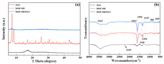 The characterization of PAN, MOF-OH, and MOF-OH-PAN involved XRD (a) and FT-IR (b) analysis.