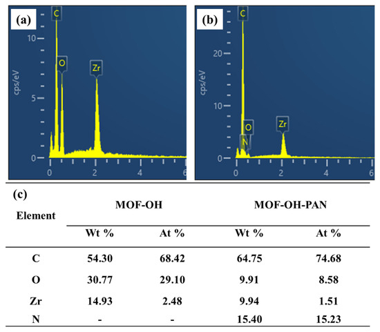 From Figure 2, the morphology of MOF-OH and MOF-OH-PAN can be seen. MOF-OH appears microcrystalline, composed mainly of C, O, and Zr (Figure 3a,c). MOF-OH-PAN maintains a fibrous structure with a reduced surface smoothness after coating with MOF-OH, composed mainly of C, O, Zr, and N (Figure 3b,c).