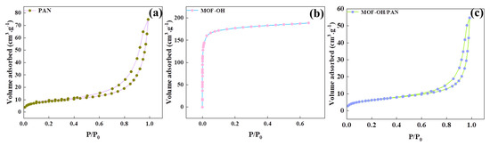 The N2 adsorption–desorption curves of PAN (a), MOF-OH (b), and MOF-OH-PAN (c).