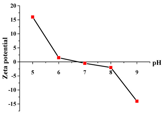 The impact of the solution pH on the adsorption property belonging to PAN, MOF-OH, and MOF-OH-PAN towards Co(II) ions is shown in Figure 5a. According to the results, the adsorption amount of these materials increases initially and then decreases when the pH level goes up from 5.0 to 9.0, with the optimal pH observed at 8.0. It is reported that cobalt ions exist in four main forms in the pH range of 5–9: Co2+, Co(OH)+, Co(OH)2, and Co(OH)3+. At pH 8.0, cobalt ions exist mainly in the form of Co2+. Under acidic conditions, the adsorption sites of the adsorbents are predominantly occupied by protonated species (Figure 6), resulting in a reduction in the available sites and diminished adsorption performance for Co(II) ions [36]. Conversely, alkaline conditions with a reduced proton concentration expose more adsorption sites, leading to an enhanced adsorption amount for cobalt ions [26]. However, at pH 9, the adsorption amount is decreased during the occurrence of the partial precipitation of cobalt ions.