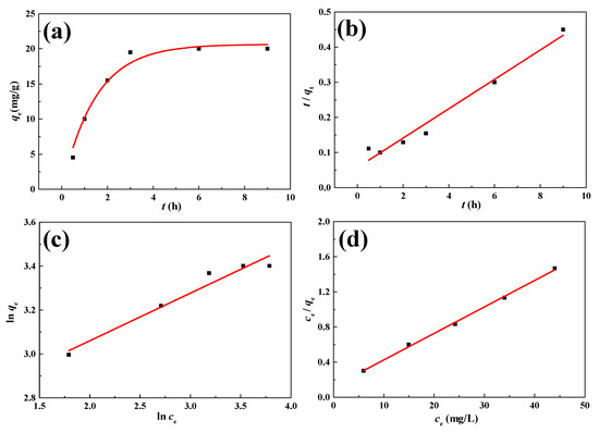 The relationship between adsorption amount and the initial concentration was examined through altering the initial concentration of cobalt ions, as illustrated in Figure 5c. The observation revealed that the adsorbing amount of Co(II) onto MOF-OH-PAN was enhanced from 20.0 mg/g to 30.0 mg/g as the original concentration of Co(II) was raised from 10 mg/L to 30 mg/L. Nevertheless, once the original Co(II) concentration enhanced to 50 mg/L, MOF-OH-PAN reached maximum adsorbing amount for Co(II), indicating that all of the adsorption sites had been tied up and reached equilibrium. Adsorption isotherms offer essential data regarding the quantity of adsorption and potential adsorption modes within the adsorption system. Therefore, Langmuir and Freundlich adsorption isotherm models [38,39,40] were evaluated in this study, which were calculated following Equations (4) and (5), respectively:
