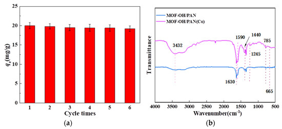The reusability performance is an essential indicator in assessing the potential for adsorbent reuse. It significantly influences the adsorption efficiency, adsorption amount, and cost when using adsorbents for wastewater treatment. Figure 8a shows the adsorpting property and FT-IR spectrum of MOF-OH-PAN for Co(II) removal after six cycles of adsorption–desorption, indicating that the nanofiber material maintains a high removal rate and stability even after multiple cycles. The material’s high stability and reusability are showcased, making it ideal for removing cobalt ions from wastewater and offering valuable guidance for treating cobalt-containing wastewater.