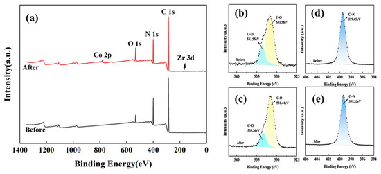The XPS spectra of MOF-OH-PAN before and after the adsorption process. (a) XPS scan full spectrum, (b,c) O 1 s spectrum, and (d,e) is the N 1 s spectrum.