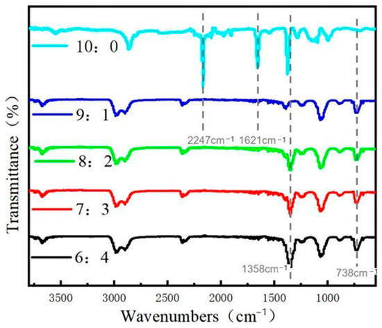 The FTIR of the nanofibrous membrane is shown in Figure 1. The peaks at 1358 cm−1, and 738 cm−1 are typical characteristic peaks of polyimide, of which 1358 cm−1 is the stretching vibration of the imide ring C−N, and 738 cm−1 is the deformation vibration of the imide ring. Moreover, with the increase in PI content from 10% to 40%, the intensity of these two peaks gradually increases. 2247 cm−1 is the characteristic absorption peak of cyanide (−C≡N) in polyacrylonitrile, and the addition of polyimide weakens the peak and shifts to the left. The results indicate that the calcined polyamide acid/polyacrylonitrile nanofibrous membrane is eliminated into the PI/PAN composite nanofibrous membrane, and the structure of PAN is slightly changed with the addition of fluorinated PI (F-PI).