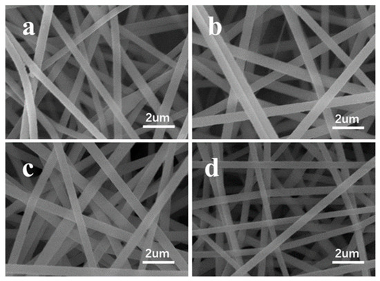 An adequate amount of spinning solution was used for electrospinning. The spinning process parameters were as follows: the advance speed of the spinning machine was 0.0010 mm/h, the applied voltage was 15 kV, the receiver roller speed was 50 r/min, the ambient temperature was 35 ± 5 °C, and the humidity was 40 ± 5%RH.
