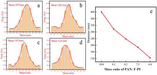 Distribution of fiber diameter in nanofibrous membranes prepared with different ratios ((a) PAN:F-PI = 9:1, (b) PAN:F-PI = 8:2, (c) PAN:F-PI = 7:3, (d) PAN:F-PI = 6:4) and diameter variation of nanofiber membranes prepared with different ratios (e).