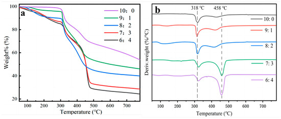 Figure 4 shows the thermal stability of the nanofibrous membrane. Before 300 °C, the thermal weight loss rate of the nanofibrous membranes is slow due to the evaporation of solvents and the completion of imide. After 300 °C, the nanofibrous membrane begins to decompose chemically. The DTG chart shows a rapid decomposition process between 298 °C and 342 °C, mainly caused by breaking the PAN macromolecular chain. A second rapid decomposition occurs at around 450 °C, with a decomposition rate and temperature similar to that of pure PAN at a small amount of F-PI (9:1). As the content of F-PI increases, the decomposition rate gradually slows down. The chemical structure stability of polyimide is mainly due to its nitrogen-containing pentameric heterocyclic ring and aromatic ring. The second decomposition is caused by polyacrylonitrile dehydrocarbonization and polyimide macromolecules’ fracture decomposition.