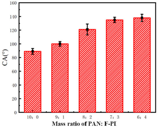 Figure 5 shows the contact angle test results for the F-PI/PAN nanofibrous membrane. The hydrophobic performance of F-PI/PAN is better than that of PAN alone. The contact angle of the nanofibrous membrane is 101.3 ± 3.4°, 115.6 ± 7.9°, 125 ± 3.8°, and 128 ± 5.2° for mass fraction ratios of 9:1, 8:2, 7:3, and 6:4, respectively. The maximum contact angle was 128 ± 5.2° at 6:4. The addition of F-PI improved the hydrophobic properties of PAN itself.