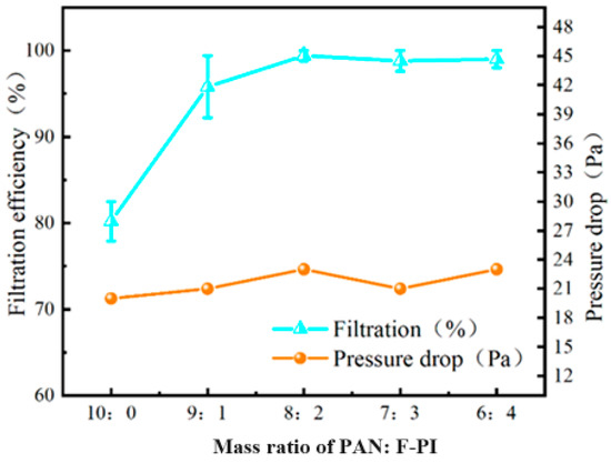 Filtration experiments were conducted using a self-made device and a nanofibrous membrane with a 1.0 g/m2 base weight. The results are presented in Figure 6. The pure PAN nanofibrous membrane had a filtration efficiency of only 80.2 ± 2.3% for PM2.5. However, with the addition of F-PI in a ratio of 9:1, the efficiency significantly increased to 95.8 ± 3.6%. Furthermore, the nanofibrous membrane’s filtration efficiency reached 99.4 ± 0.3% when the mass ratio of F-PI was 8:2. The efficiency of the blending process significantly improved due to the strong electronegativity of the fluorine atoms. The introduction of F increased the polarity of the polyimide, resulting in an uneven distribution of intramolecular charge and a greater dipole moment, which strengthened the molecular inter-atomic forces. Thus, the interaction between the composite nanofibrous membrane and particulate matter is enhanced, resulting in a significant improvement in the filtration performance of the composite nanofibrous membrane. The fluorocarbon bond, which has a very low surface energy due to the fluorine atom, currently provides the strongest hydrophobic performance. During the filtration process, wet particles accumulate on the surface of the nanofibrous membrane and subsequently break off. The membrane’s porosity and pressure drop remain unchanged. However, adding fluorinated polyimide significantly improves the filtration performance of the nanofibrous membrane while maintaining a filtration efficiency of 99.0%. This improvement is achieved by increasing the proportion of F-PI.