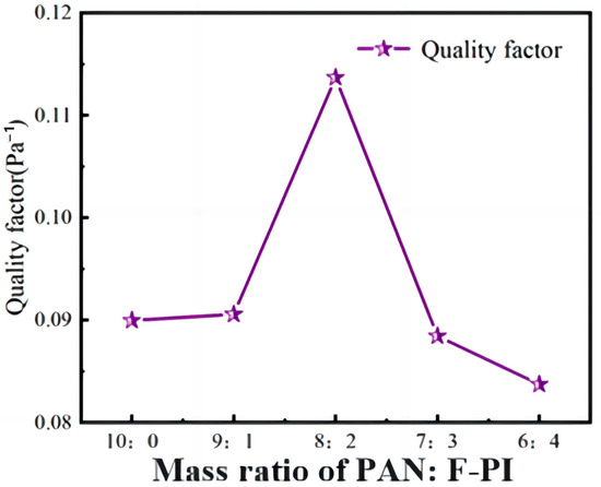 Quality factor of nanofibrous membranes prepared with different PAN:F-PI ratios.