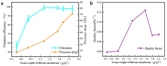 (a) Filtration performance and (b) quality factor of nanofibrous membranes prepared with different gram weights.