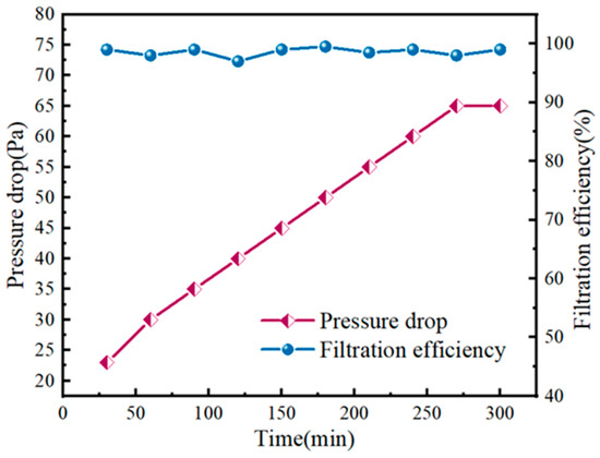 To investigate the performance of the nanofibrous membrane, the change in resistance pressure drop during filtration was studied. Figure 9 shows the change in resistance pressure drop of the nanofibrous membrane within 300 min. The pressure drop gradually increases with the extension of filtration time, and the resistance pressure drop increases linearly between 0 and 250 min. At 250 min, the resistance pressure drop is 65 Pa, and then it remains stable for 60 min. It takes 300 min to reach the maximum dust capacity at ultra-high concentrations.