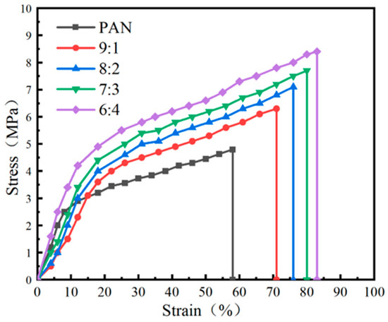 The mechanical properties of fluorinated PI/PAN nanofibrous membranes were tested using a universal tensile testing machine. Figure 10 presents the results indicating that adding F-PI improves the nanofibrous membranes’ mechanical properties. The inclusion of F-PI, which contains numerous nitrogen-containing five-membered heterocyclic and aromatic rings, led to the creation of inflexible molecular chains, thereby enhancing the mechanical strength and elongation at the break of the nanofibrous membranes. At a mass ratio of 9:1, the elongation at break is 71%, and the breaking strength is 6.3 MPa. At a mass ratio of 6:4, the elongation at break is 83%, and the breaking strength is 8.4 MPa. In addition, the fracture strength of the nanofibrous membranes was improved, and their elongation at break was increased. This was due to the increased number of solution-binding sites after mixing.