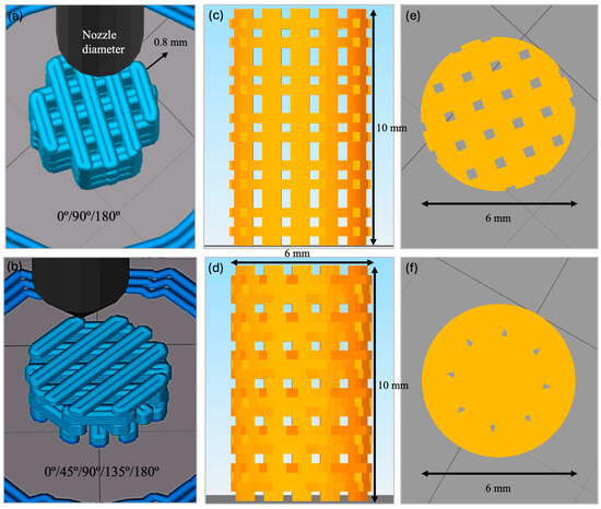 Illustrations from Simplify 3D Professional Software of the 3D printing process of alternate (a) and helical (b) scaffolds and final open porosity distribution of alternate (c,e) and helical (d,f) structures.