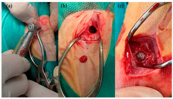 To perform the surgical procedures, rabbits were premedicated by administering an intramuscular combination of medetomidine (50 ug/kg, Domtor, Esteve, Barcelona, Spain), ketamine (25 mg/kg, Imalgène 1000, Merial, Toulouse, France), and buprenorphine (0.03 mg/kg, Buprex, RB Pharmaceuticals, Berkshire, UK). Then, inhalatory anesthesia (Isoflurane, inspiratory Fraction ISO 2.5–4%, Isova-vet, Schering-Plow, Madrid, Spain) was utilized to induce and maintain general anesthesia. Furthermore, enrofloxacin (5 mg/kg SC, Ganadexil 5%, Invesa, Barcelona, Spain) and meloxicam (0.2 mg/kg SC, Metacam, Boehringer Ingelheim España, Barcelona, Spain) were administrated in order to obtain antibiotic prophylaxis and pain control, respectively. A circular bone defect 6 mm in diameter was performed on the rabbit’s lateral femoral condyle bilaterally after cutting skin and muscle layer by layer, using a trephine burr (227B.204.060, Komet, Germany) connected to a surgical motor under irrigation (Figure 2). The fabricated scaffolds were implanted in the created bone tunnels, and each one was allocated to one of the two treatment groups according to block randomization: PLA-12CaP-ALT (alternate structure) and PLA-12CaP-HEL (helical structure). After suturing, an intramuscular injection of atipamezole (25 µg/kg IM, Nosedorm, Karizoo, Barcelona, Spain) was administered to revert the sedation, and then the rabbits were placed in the cages. Enrofloxacin (5 mg/kg, Ganadexil 10%, Invesa, Barcelona, Spain) and meloxicam (0.1 mg/kg, Metacam, Boehringer Ingelheim España, Barcelona, Spain) were utilized postoperatively for 5 days, with the same aim as reported above. In addition, veterinarians monitored the rabbits weekly for wound dehiscence, inflammation, infection, lameness, and general health.