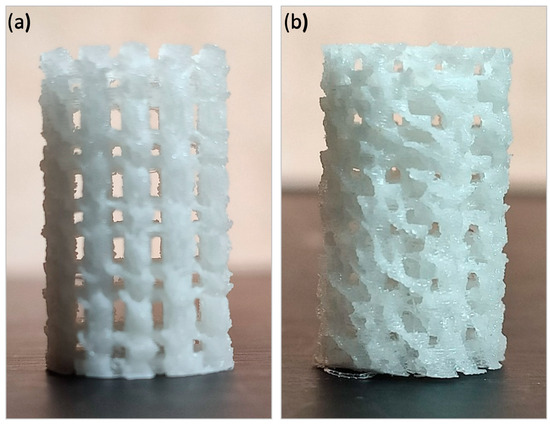 The macroscopic architecture of the 3D-printed scaffolds (Ø: 6 mm × h: 10 mm): alternate structure (a) and helical structure (b).