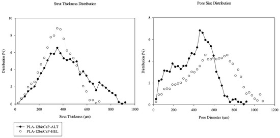 Concerning strut thickness, higher mean values were appreciated in the alternate group compared with the helicoidal one (430 ± 80 μm vs. 350 ± 20 μm) (Table 1). Furthermore, apparent differences could also be observed between alternate and helical structures regarding strut thickness distribution (Figure 4). Even though both structures peaked at 352.2 μm, the alternate one presented a more comprehensive range of sizes, reaching strut thicknesses up to 800 μm. The differences between laydown patterns probably caused these results since the filaments were aligned in the alternate structure, and they could merge and be interpreted as one during micro-tomographic analysis. Due to its layer configuration, something that will hardly happen in the helical structure involves the deposition of staggered fibers varying by 45 degrees.