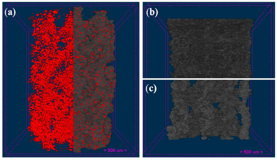 Three-dimensional images were obtained using Micro-CT (SkyScan 1172, Bruker-microCT, Kontich, Belgium). Scanning parameters were set to 13.54 µm pixels, X-ray sources of 70 kV and 141 mA, and a 0.5 mm Aluminum filter. The samples were rotated 360 degrees around their vertical axis with a rotational step of 0.4 degrees. The raw images of the scaffolds were reconstructed using the Skyscan standard software (NRecon, Bruker-microCT, Kontich, Belgium) to serial coronal-oriented tomograms using a modified back-projection algorithm [44] and subsequently analyzed with another program (CTAn, Bruker-microCT, Kontich, Belgium). For 3D analysis, the volume of interest (VOI) was defined as a cylindrical region of 5.5 mm centered on the scaffold, with a total length of 8.0 mm (591 slides). Then, Anisotropic Diffusion filtering, the histogram-based manual thresholding method [45], and the despeckle tool were applied to the images before quantification of specific parameters such as open porosity, object surface per volume ratio (ObjS/V ratio), strut diameter (defined as strut thickness, St.Th) and pore size (defined as strut separation, St.Sp.). Likewise, interconnectivity was calculated with an algorithm considering only the open and accessible porosity volume within the scaffold, as previously described [46,47].